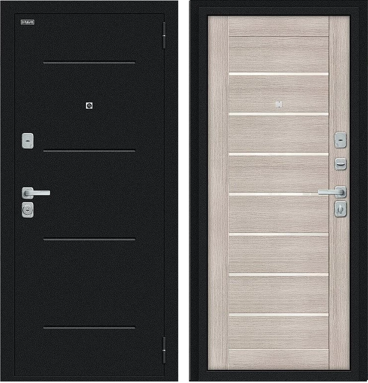 Надежная входная Дверь Браво Техно/BChrome Букле черное/Cappuccino Melinga премиум класса по цене 30 800 руб. Большая толщина стали защитит от проникновения в ваш дом, квартиру или коттедж. Используется очень качественная фурнитура: замки, цилиндры, ручки, защелки. Покрытие и отделка двери изготовлено под внимательным контролем производителя. Дверь имеет долгий срок службы и гарантию.